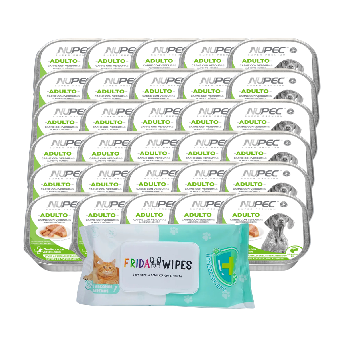 Brinda a tu perro adulto una alimentación completa y deliciosa con el Pack Nupec Digestive, que incluye 20 latas de alimento húmedo de 100 g cada una, especialmente formulado para mejorar la salud digestiva, junto con toallitas Frida Wipes para mantener su higiene diaria.