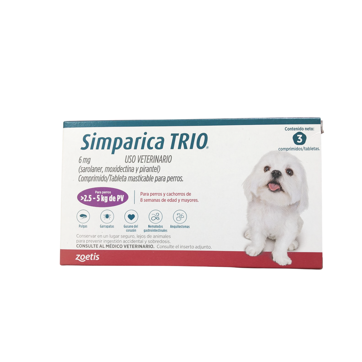 Ideal para perros a partir de las 8 semanas de edad, Simparica Trio está disponible en diferentes dosis según el peso del perro. Para un uso adecuado, se recomienda consultar al médico veterinario.